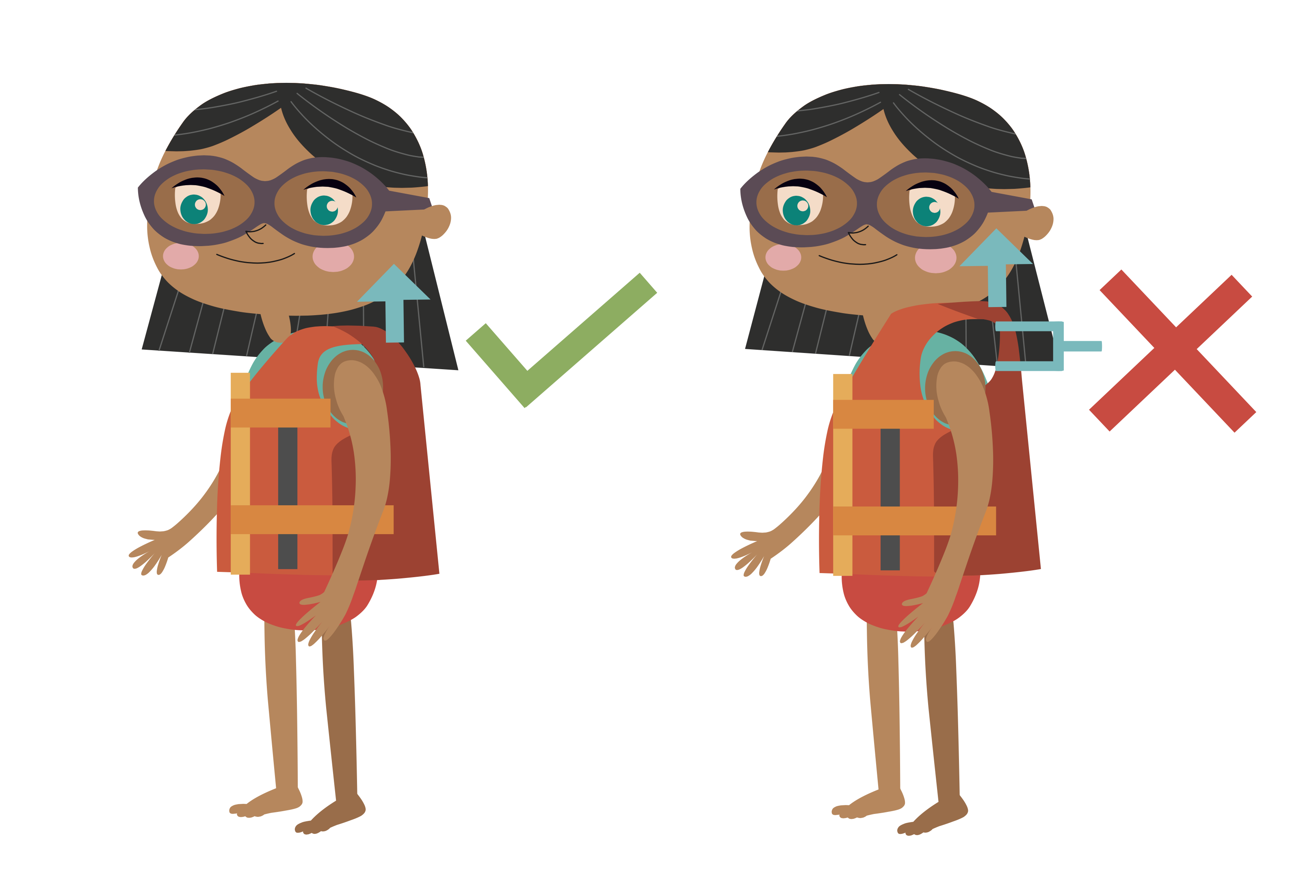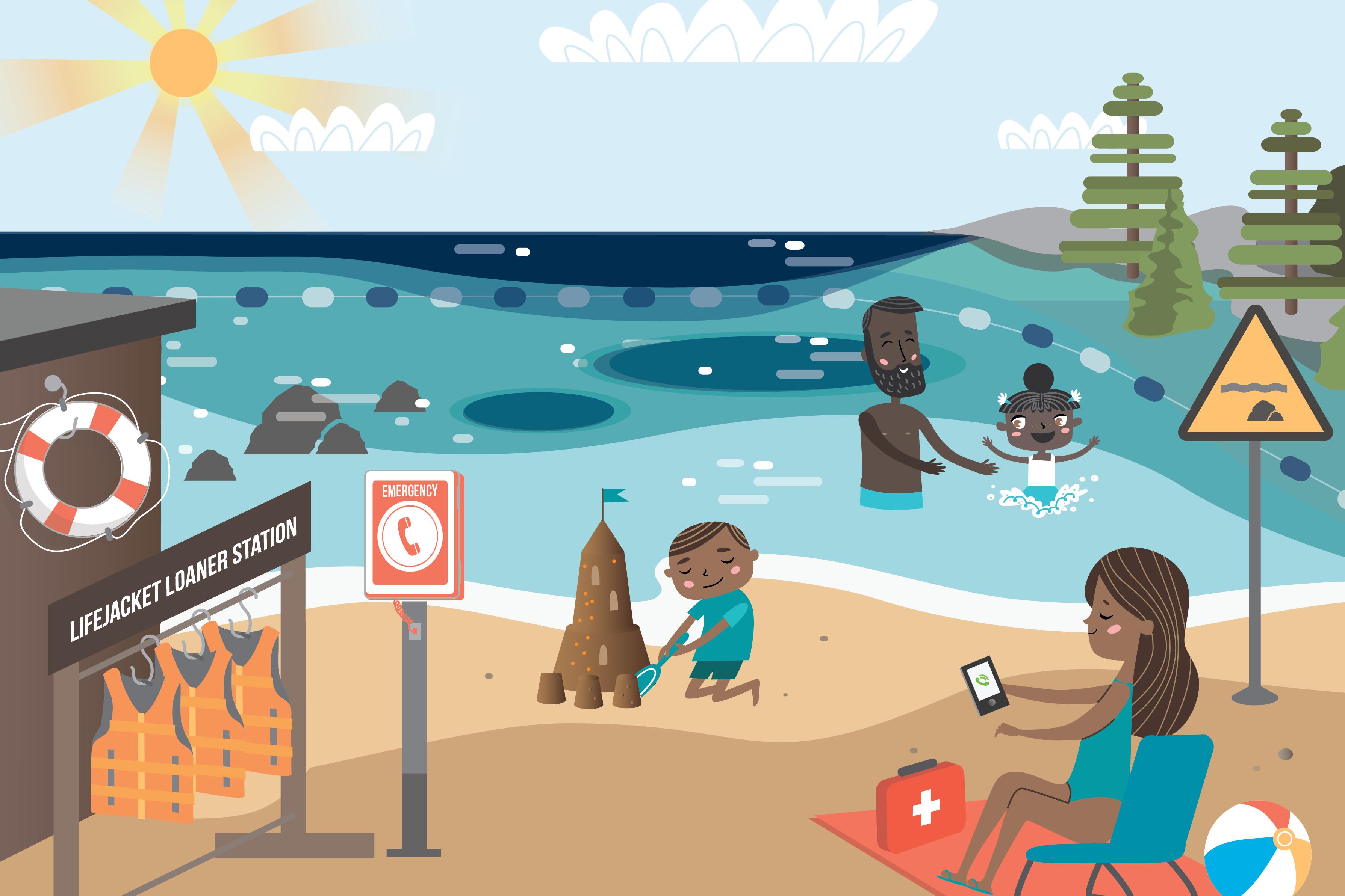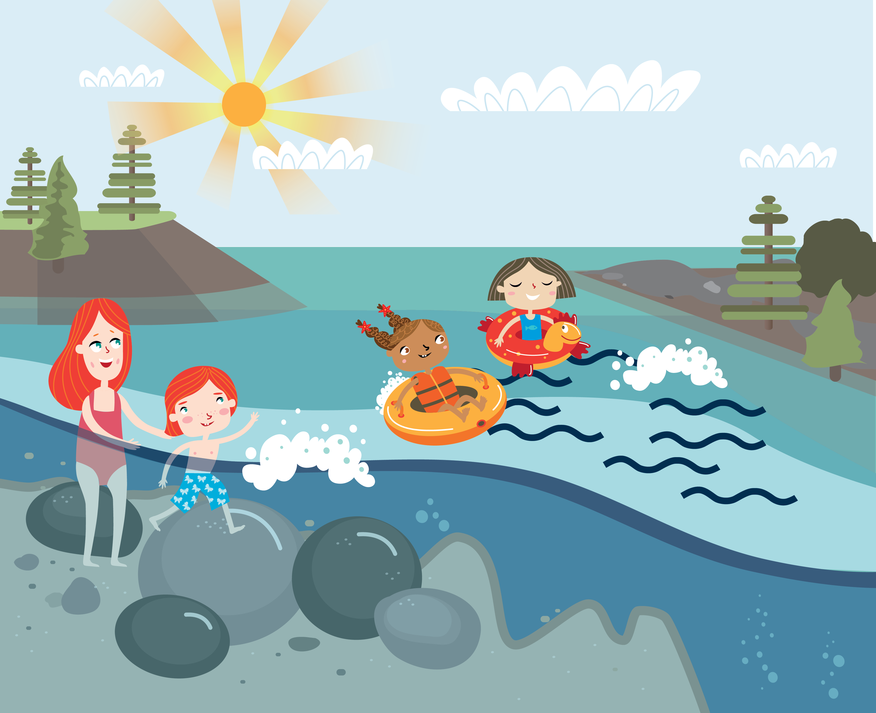 Making water safety easy to understand and approachable to kids through the use of cheerful illustrations and diagrams was the primary goal of this project. Character styles were provided, and the illustrations were intended to situate these characters within environments that would require awareness to water safety.
