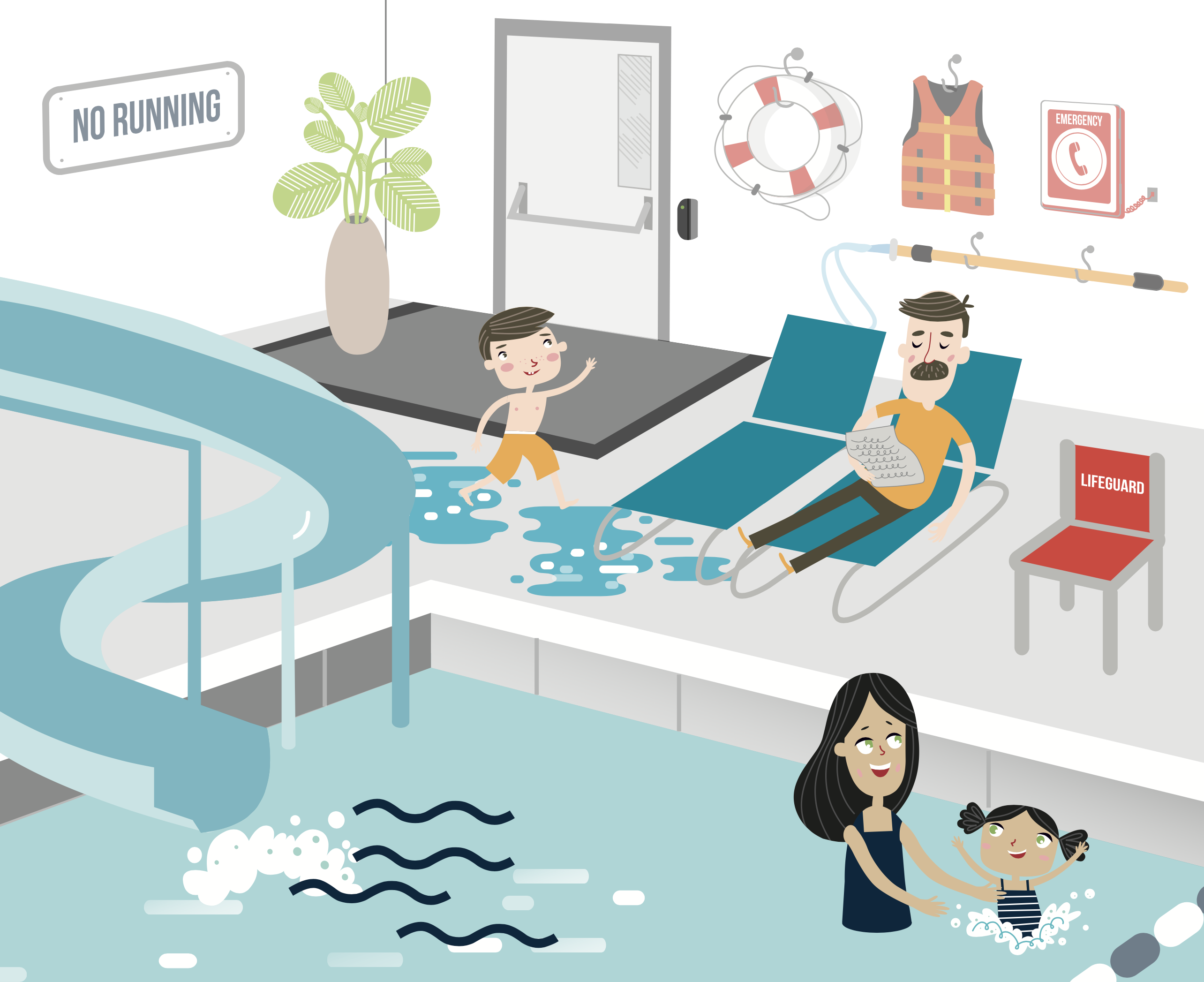 Children were encouraged to spot both the safety features and safety hazards of each setting (hotel pool, river, waterfront). These illustrations were used as an educational tool, in an activity workbook. Materials were carefully reviewed for accurate portrayal of safety features, ensuring accurate representation of communication objectives.